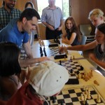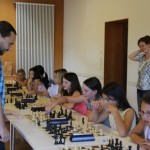 Als kleines Rahmenprogramm folgte dann ein Uhren-Simultan. Die Turnierleiter Sebastian und André traten an jeweils neun Bretttern gegen die Mädels an und das ganze sehr ambitioniert mit 25 gegen 10 Minuten. Zudem bekamen die Beiden noch Eibhias´s Vater Colm O’Muireagain (ELO 927) und den fünfjährigen Vinzenz Schilay als „Assistenten“ zur Seite gestellt, wobei fraglich war ob die beiden mit ihren Zügen den Simultanspielern oder den Gegnerinnen eine Hilfe sein würden… Dabei hatte Colm gute Erfahrungen im Simultan gemacht, allerdings auf der anderen Seite des Brettes im Rahmen der 200-Jahrfeier der Züricher Schachgesellschaft. Dort traten am 22. August 2009 200 Amateure gegen acht Champions (Kasparov, Karpov, Kortschnoj, Spasski, Topalov, Anand, Kramnik und Judith Polgar) an und Colm gewann einen der 200 Plätze. Er überraschte – dank Top-Vorbereitung! – Ex-Weltmeister Boris Spasski mit einer Neuerung und stand somit klar besser. Spasski ließ sich sogar einen Stuhl holen um die Stellung einer genauen Analyse zu unterziehen. Am Ende bleib ihm aber nichts anderes übrig als zähneknirschend Colm´s Remisgebot anzunehmen (Bild bei Chessbase, Video bei YouTube).
