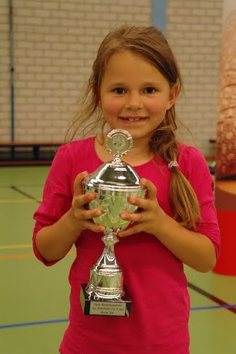 Maria wurde sensationell hollaendische Meisterin!!!!!!! in der U8 (Offiziell: Meisjeskampioen de Nederlande G/H). Der einzige auslaendische Titeltraeger soweit ichs bei der Siegerehrung mitbekommen bzw. verstanden hab. Ihre 6,5 Punkte aus 13 Runden waren aber tatsaechlich sensationell gut. Wenn Lorenz die letzte Runde nicht gewonnen haette waere er auch bei 7 Punkten stehen geblieben und haette dabei auch kein allzu schlechtes Turnier gespielt. Maria hatte ein „echtes Endspiel“ zumindest von der Spannung her, sie hatte 5,5 eine Runde vor Schluss genau wie Eva Zijdemanns (einen Platz vor ihr mit 1,5 Buchholz mehr!!!) in Lauerstellung war noch Eva van Harten mit 4,5 (und wiederum 2,5 Buchholz mehr als Eva Z.). Wobei beide Evas schon in den „Genuss“ des Freiloses gekommen waren und Maria alles gespielt hatte. Maria hatte alle Truempfe in der Hand nachdem beide Evas ihre Spiele relativ schnell (30-45 min) verloren. Maria behielt die Neven und gewann nach knapp 60 min gegen einen guten Gegner!!! Maria musste nach der Siegerehrung ein fast 30 min. interview geben (Ich war als „Dolmetscher“ dabei, zur Not mussten wir eben unser Englisch auspacken): nach dem Motto „Du bist Meisjeskampioen de Nederlande aber Holland kennt dich noch nicht“.