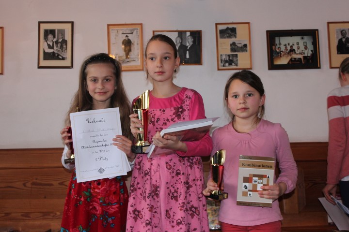 Siegerehrung U10: 2. Vitalia Khamenya (SK Gräfelfing), 1. Sonja Kukulina (Schachklub München Südost) und 3. Maria Schilay