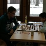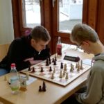 Der Wettkampf begann verheißungsvoll, hatte doch Timon Götz im Mittelspiel das Kommando übernommen und alsbald einen Bauern erobert. Unter Ausnutzung einer Fesselung kam ein Zweiter hinzu, wonach sein Freibauer nur unter Figurenopfer zu stoppen war. Der kurzfristig eingesprungene Ersatzmann Max Herrmann brachte mit heterogenen Rochaden Schwung in seine Partie, versäumte es aber seinen Angriff am Königsflügel konsequent fortzusetzen. So war eine ausgeglichene Stellung entstanden, bis Max ein verhängnisvolles Schach gab und somit seinem Gegenüber einen Doppelangriff auflegte. Johannes Hierl hatte einen kritischen Moment in der Eröffnung zu überstehen, danach entspann sich ein ausgeglichener Kampf bis es taktisch wurde: mit einer Springergabel eroberte Johannes eine Qualität, allerdings hätte er diese dank eines Konters sofort zurückgeben müssen. Dieser wurde aber vom Gegner übersehen, stattdessen setzte er alles auf eine Karte und nachdem Johannes alle Drohungen pariert hatte, durfte er einen Turm mehr sein Eigen nennen. Derweil gab es in der Partie von Paul Neppert ein wildes Gemetzel, was angesichts des in der Mitte verbliebenen gegnerischen Königs nur zu begrüßen war. Paul bekam drei Bauern für seine geopferte Figur und beste Angriffschancen, so dass man dem schwarzen Monarchen keine rosige Zukunft prognostizieren konnte. Mit wenig Zeit auf der Uhr fand Paul nicht die besten Züge, der Kontrahent setzte zum Gegenschlag an und die Stellung wogte einige Zeit hin und her bis letztlich Paul die Waffen strecken mmusste. Danach spielte sich beim Stand von 2:2 am Spitzenbrett ein wahres Drama ab. Lorenz Schilay und sein Dauerkonkurrent Joseph Homi befanden sich nach etwas mehr als 20 Zügen in Zeitnot. Hier hätte Lorenz eine Figur gewinnen können, übersah diese Möglichkeit aber und stand nur etwas besser. Daher lehnte er ein Remisgebot ab, lief aber kurz darauf in eine Springergabel und war fortan mit einer Quali weniger chancenlos. Eva Schilay kam gut aus der Eröffnung, nach einem fragwürdigen Springerzug hätte ihr Gegenüber aber die Möglichkeit gehabt leicht in Vorteil zu kommen. Danach übernahm Eva die Initiative, griff an und konnte dank zweier Freibauern in Kombination mit aktiven Figuren den Sieg einfahren.