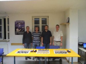 Am zweiten Turnier griff nun auch Kevin Beesk ins Turniergeschehen ein und legte gleich eine Siegesserie hin beginnend mit einem Auftakterfolg über Mattias. Jozef revanchierte sich bei Sebastian für die Auftaktniederlage beim letzten Turnier. Sebastian hatte im Mittelspiel seinen Springer für drei Bauern gegeben, musste dann aber zwei Schwerfiguren tauschen und kam an den König nicht ran. Das Endspiel T+S gegen T behandelte er dann nicht gut und verlor Bauer um Bauer. Erwin kam zu einem durchschlagenden Königsangriff gegen Franz Xaver und Martin setzte sich gegen Georg Pröbster durch. Dafür musste sich Martin in Runde zwei Kevin geschlagen geben, während Erwin gegen Wolfgang nicht über ein Remis hinaus kam. Jozef setzte sich dank der besseren Leichtfigur im Endspiel gegen Johannes Hierl durch. Das Spitzenduell zwischen Kevin und Jozef entschied Kevin für sich und Erwin verspielte seinen Vorteil gegen Martin ins Remis. In Runde vier sah es für Kevin auch gegen Erwin gut aus, aber er kam vom rechten Weg ab und die Partie kippte sogar noch. Durch Kevins Niederlage konnte nicht nur Erwin mit ihm gleichziehen, sondern auch Jozef mit einem Sieg über Thomas sowie Sebastian der Mattias bezwang. Und das Führungsquartett blieb in der letzten Runde unter sich: Kevin traf auf Sebastian und Erwin kreuzte mit Jozef die Klingen. Doch zunächst legte Martin mit einem Erfolg über Franz Xaver vor und übernahm mit 3,5 Punkten vorrübergehend die Führung. Erwin und Jozef trennten sich remis und gesellten sich zum 3,5-Punkter Martin. Derweil war Kevin gut aus der Eröffnung gekommen und drohte bei geschlossenem Zentrum am Königsflügel zu attackieren. Daher öffnete Sebastian die f-Linie um etwaige Angriffschancen auf den König in der Mitte zu bekommen, was Kevin allerdings einen Monsterspringer im Zentrum einbrachte. Positionell sah die Stellung für Schwarz nicht gut aus, als aber Kevin zum finalen Schlag mit dem f-Bauern-Vorstoß ansetzte, kam die Dame von Sebastian auf die Grudnreihe und stellte dem König mit lästigen Schachgeboten nach. Mit meist nur 15-20 Sekunden auf der Uhr gab es ein spannendens Duell im Endspiel, doch nach eine guten Stunde Spielzeit hatte Kevin keinen Gewinnweg gefunden und man einigte sich mit D+S gegen D+L mit jeweils einem vorgerückten Bauern auf remis. Damit hatten am Ende gleich fünf Spieler 3,5 Zähler auf dem Konto, die beste Buchholz hatte dabei Kevin knapp vor Jozef und Erwin sowie Martin und Sebastian.