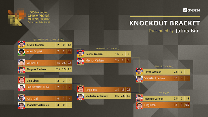 Im Halbfinale legte Aronian gegen Carlsen vor, musste aber umgehend den Ausgleich hinnehmen, nachdem er im Turmendspiel ein wichtiges Tempo verschenkt hatte. Die dritte Partie endete schnell remis und zum Abschluss landete Aronian in einer hoffnungslosen Stellung, nachdem er selbst den Damenflügel verriegelt hatte, wo doch Carlsen alle Trümpfe am Königsflügel hatte. Dort brach er dann auch durch, aber nach einem Fehler war unerwartet ein haltbares Tumrendspiel entstanden, wo Aronian an einer Stelle nicht den einzigen Remisweg fand und somit doch das erste Match verlor. Tags darauf griff Aronian in der Auftaktpartie zuerst daneben, aner Carlsen ließ die Chance vorüberziehen. Das Endspiel war dann ausgeglichen, bis Carlsen den Turm tauschte und sein Springer vom gegnerischen Läufer austempiert wurde. Danach hielt Aronian mit ungleichfarbigen Läufern trotz Minusbauer remis, doch in der dritten Partie erreichte Carlsen deutliche Vorteile im Mittelspiel. Trotzdem bekam er nicht mehr als ein Damenendspiel mit Mehrbauer heraus, aber genau den wichtigen Freibauern büßte Carlsen ein und musste mit einer weiteren Punkteteilung Vorlieb nehmen. Zum Abschluss hatte der Weltmeister wieder Vorteile, doch nach einem Fehler kippte die Partie und Aronian hatte den Blitz-Entscheid erzwungen. Hier war Carlsen gegen So im Viertefinale zurückgekommen, aber in der ersten Partie eroberte Aronian mit feiner Taktik einen Bauern, den er im Turmendspiel sicher verwertete. In Partie zwei hatte Aronian früh alles unter Kontrolle und zog somit zum zweiten Mal ins Finale ein.