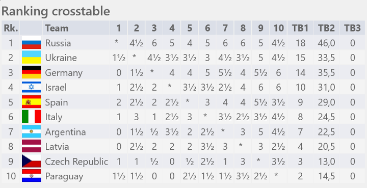 Im Vorjahr hatte Gruppenplatz drei noch für die Playoff-Phase gereicht, da nur die Gruppensieger direkt ins Viertelfinale einzogen, während die Zweit- und Drittplatzierten deren Gegner ermittelten. Mit Titelverteidiger Russland war die Favoritenrolle auf den Gruppensieg klar vergeben und Russland demonstrierte seine Stärke mit neun souveränen Siegen. Das Duell mit Vorjahres-Viertelfinalist Ukraine entschied dann wie erwartet das Rennen um Rang zwei. Trotzdem kann Deutschland auf ein starkes Turnier zurückblicken, sieben Siege in diesem Feld sind alles andere als selbstverständlich und die Tatsache, dass man trotz der 1,5:4,5 Niederlage im direkten Vergleich am Ende zwei Brettpunkte mehr als die Ukraine hatte iste ebenfalls ein Fingerzeig.