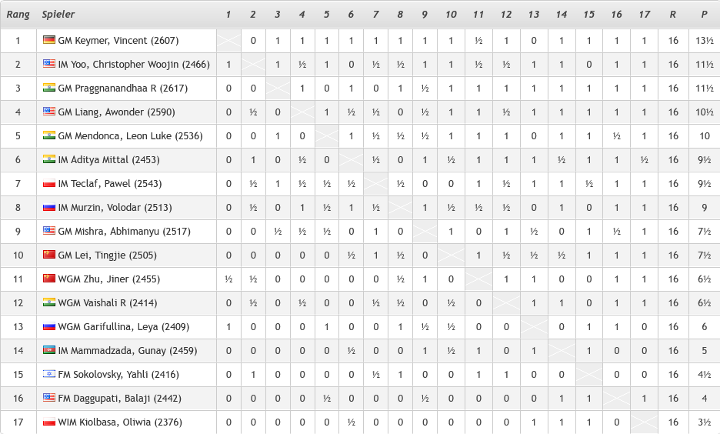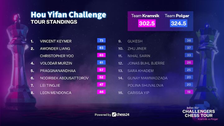 Der erste Tag sah Vincent Keymer und Praggnanandhaa vorne wegmarschieren. Dabei hatte Keymer mit Awonder Liang und Volodar Murzin, dem er bei allen drei bisherigen Etappen unterlegen war, ein hartes Auftaktprogramm. In Runde 5 musste Keymer gegen Yoo die erste Niedelage quittieren, als er in Zeitnot im Endspiel daneben griff, während Pragg mit 5/5 durchzog. Wegen des ungeraden Teilnehmerfeldes gab es ein Freilos, weshalb Keymer am zweiten Tag nur drei Partien hatte. Diese gestaltete er allesamt siegreich, aber Pragg baute seine Serie auf beeindruckende 9/9 aus. Doch zu Beginn von Tag drei erwischte es auch den Inder, der sich Yoo geschlagen geben musste. Derweil konnte Keymer gewinnen und kam mit einer Partie weniger auf einen Punkt heran. In Runde 11 kam es zum direkten Duell und Keymer zeigte seine positionelle Klasse, drückte mit dem Läuferpaar und gewann einen Bauern. Pragg verteidigte sich zäh, doch wie so oft wenn man die ganze Partie über mit dem Rücken zur Wand steht, kam noch ein Fehler. Er übersah, dass Keymer den Turmtausch erzwingen konnte und das folgende Läuferendspiel war klar gewonnen. Damit hatte Keymer mit 9/10 die Führung vor Pragg 9/11 und Yoo 8/10 übernommen. Doch gegen Leya Garifullina kam umgehend ein Dämpfer. Zwar konnte sich Keymer mehrfach in die Partie zurückkämpfen, aber der letzte Fehler war dann einer zu viel. Pragg übernahm mit einem Remis wieder die Spitze und Yoo schloss nach Punkten zu Keymer auf. In Runde 13 ließ die Konkurrenz Punkte liegen, während Keymer seine Partie gewann und somit mit einem halben Zähler Vorsprung in den letzten Tag ging. Bei den bisherigen Turnieren bot dieser großes Drama und auch diesmal sollte es nicht anders sein. Runde 14 gewann Keymer im Endspiel, während Yoo ein Remis abgab. Gegen die Chinesin Zhu berechnete Keymer seine geplante Variante falsch, nahm Abstand von ihr und geriet in arge Bedrängnis. Mit einem Quali-Opfer verschaffte er sich Luft und hielt die Partie remis. Da gleichzeitig die Konkurrenz verlor, hatte er vor den letzten beiden Runden eine exzellente Ausgangsposition. Keymer führte mit 11,5/14 vor Pragg mit 10,5/15 und Yoo mit 10/14. Also reichte ein Punkt zum Turniersieg. Mit Yahli Sokolovsky wartete ein Gegner, der bislang erst 4,5 Zähler erzielt hatte, aber gerade gegen Yoo gewonnen hatte. Und auch Keymer geriet in eine aussichtslose Lage, hatte zwei Bauern weniger und die Freibauern am Damenflügel marschierten unaufhaltsam nach vorne. Aber mit Sekunden auf der Uhr kann alles passieren und als die Engine schon Matt in 10 anzeigte, übersah Sokolovsky ein Abzugsschach, verlor die Dame und Keymer holte einen nicht mehr für möglich gehaltenen Sieg. Da spielte es auch keine Rolle mehr, dass Yoo seine Partie aus mißlicher Lage gedreht hatte, Keymer stand vor der letzten Runde als Turniersieger fest. Hier konnte er einen weiteren Erfolg einfahren und hatte am Ende mit 13,5/16 sogar zwei Punkte mehr auf dem Konto als Yoo und Pragg. Nach seinem Sieg bei der Kramnik Challenge ist es Keymers zweiter Triumph in Folge und er ist der Einzige dem auf den vier Etappen zwei Turniersiege gelangen. Mit den Rängen 6, 3, 1 und 1 gewinnt er mit 73 Punkten die Gesamtwertung und zieht souverän ins Finale der besten Acht ein, das vom 14. – 17. Oktober ausgetragen wird.