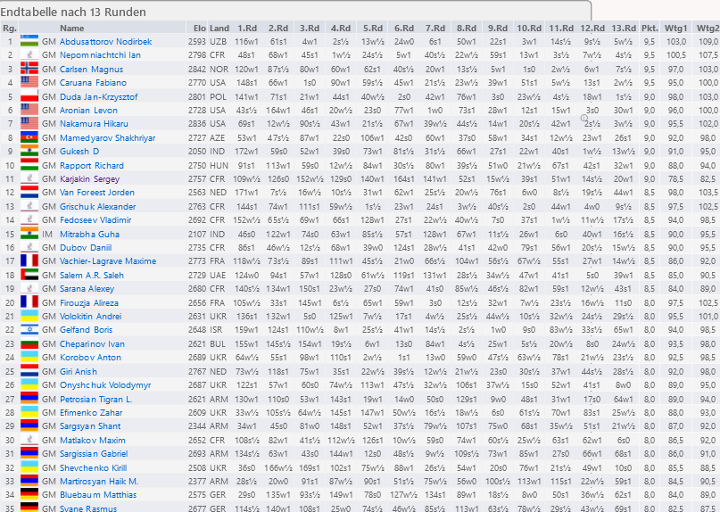 Der Abschlusstag begann mit der ersten Niederlage des Weltmeisters, der gegen Abdusattorov (Video bei Chessbase India) weiter auf Gewinn spielte, als er die Remisreißleine hätte ziehen sollen. Nach einem Remis gegen Nepo demonstrierte Carlsen gegen Aronian feine Endspieltechnik (Video bei Chessbase India) und schloß wieder zu den Führenden auf. Mit Abdusattorov, Nepo, Carlsen und Fabiano Caruana ging ein Quartett mit 9/12 in die letzte Runde. Hier forcierte Caruana überraschend ein schnelles Remis gegen Nepo, obwohl er die schlechteste Buchholz hatte. Da bei Punktgleichheit nur die beiden Besten nach Feinwertung einen Tie-Break um den Titel spielen würden, musste Carlsen gegen Nakamura gewinnen, falls Abdusattorov gegen Duda punkten würde. Der Spitzenreiter stand zwischenzeitlich auch deutlich schlechter, rettete sich aber ins Remis. Carlsen dagegen verpasste eine Gewinnidee im Turmendspiel (Video bei Chessbase India) und musste sich in die Punkteteilung fügen. Damit lautete die Reihenfolge an der Spitze: Abdusattorov vor Nepo, Carlsen und Caruana. Auf Rang fünf kam Duda der ein Septett mit 9 Punkten anführte. Abdusattorov und Nepo spielten nun den Titel im Tie-Break aus, der zunächst zwei Blitzpartien (3+2) vorsah, ehe weitere Blitzpartien auf dem Programm standen, bis es eine Gewinnpartie geben würde. In der ersten Partie landete Abdusattorov in einem unangenehmen Endspiel, zog aber auch dank mehr Zeit auf der Uhr den Kopf aus der Schlinge. Mit den weißen Steinen (Video bei Chessbase India) war dann der 17jährige Usbeke am Drücker, übersah zwar im dramatischen Zeitnotfinale ein zweizügiges Matt, behielt am Ende aber die Oberhand und kürte sich zum jüngsten Schnellschachweltmeister der Geschichte (Interview bei Chessbase India). Blübaum und Svane kletterten am letzten Tag mit guten 8/13 auf die Ränge 34 und 35. Daniel Fridman kam mit 7,5 Zählern auf Platz 46, Alexander Donchenko (7) und Andreas Heimann (6) belegten die Ränge 69 und 115. Bei den Frauen brachte Kosteniuk mit drei Unentschieden ihren Vorsprung über die Ziellinie und gewann den Titel mit 9/11 vor Bibisara Assaubayeva mit 8,5, Gunina und Lagno mit je 8 sowie neun Spielerinnen mit je 7,5 angeführt von Serikbay. Mit einem starken Schlussspurt klassierten sich Pähtz und Marta Michna auf den Rängen acht und zehn. Die deutsche Schnellschachmeisterin von 2019 in Neumarkt Annmarie Mütsch belegte mit 6,5 Zählern Platz 25.
