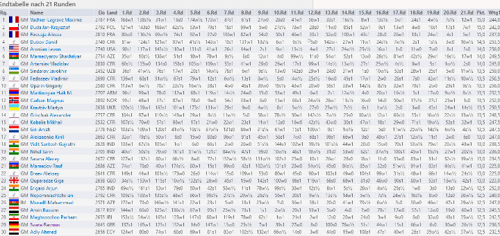 Der zweite Tag begann mit der schlechten Nachricht, dass ein Corona-Test von Nakamura positiv war. Nachdem daraufhin alle Spieler getestet wurden, entschied man sich trotzdem das Turnier fortzusetzen. Hier schüttelte Aronian seinen ärgsten Verfolger Amin mit einem Sieg ab, während Carlsen gegen Maghsoodloo gewann. Doch der Titelverteidiger unterlag in den Runden 15 und 16 erst Giri (Video bei Chessbase India) und dann Grischuk (Video bei Chessbase India), womit er im Prinzip aus dem Rennen war. Derweil führte Aronian mit einem Punkt Vorsprung, ehe auch er aus dem Tritt kam und drei Niederlagen am Stück gegen Maxime Vachier-Lagrave, Hail Martirosyan und Artemiev kassierte. Neuer Spitzenreiter war nun Dudov, der aber wiederum in der vorletzten Runde von Alireza Firouzja bezwungen wurde. Dieser schien nach 16 Runden mit nur zehn Zählern auf dem Konto nichts mit der Titelvergabe zu tun zu haben, schloss aber mit vier Siegen am Stück zur Spitze auf. Diese bestand aus sechs Spielern mit 14 Punkten: Aronian, Dubov, Artemiev, Duda, MVL und Firouzja. In der letzten Runde lauteten die Paarungen: MVL – Carlsen, Duda – Artemiev, Firouzja – Aronian und Dubov – Giri. Letztere einigten sich schnell auf Remis, während Firouzja mit einem weiteren Sieg die Spitze übernahm. Duda gesellte sich zu ihm und da Carlsen gegen MVL auf Gewinn stand, sah es danach aus, als würde Firouzja tatsächlich in den Tie-Break kommen. Allerdings entglitt Carlsen sein Vorteil und am Ende lief er ins Matt (Video bei Chessbase India). Damit lagen MVL, Duda und Firouzja mit 15/21 in Front (die Drei hatten kurioserweise nicht gegeneinander gespielt), gefolgt von Dubov mit 14,5, Aronian, Shakhriyar Mamedyarov sowie Artemiev mit 14 und neun Spielern mit je 13,5, darunter Carlsen auf Rang zwölf. Schnellschach-Weltmeister Abdusattorov kam diesmal nicht in Fahrt, lag nach Tag eins mit 6,5/12 nur auf Platz 65 und beendete das Turnier mit 12 Zählern auf Rang 46. Im Tie-Break zwischen MVL und Duda hatte der Franzose in beiden Partien leichte Vorteile, doch sie endetet jeweils Remis. Die folgende Partie (Video bei Chessbase India) brachte dann die Entscheidung: Duda landete im Mittelspiel in einer passiven Stellung, die MVL dank seines starken Läufers in Verbindung mit seinem Freibauern in ein gewonnenes Turmendspiel abwickelte und sich somit seinen ersten WM-Titel sicherte (Interview bei Chessbase India). Rasmus Svane begann mit einem Remis aus den ersten beiden Runden, gewann dann aber vier Partien in Folge, womit er mit 12/18 bis auf Rang 14 kletterte. In den letzten drei Runden kam noch ein Remis hinzu und er klassierte sich auf einem sehr guten 29. Platz. Dank eines starken Schlussspurts mit vier Siegen, darunter ein Erfolg über Sergey Karjakin in der letzten Runde, kam Alexander Donchenko mit ebenfalls 12,5/21 auf Platz 34. Matthias Blübaum belegte mit 11 Zählern Rang 76, Daniel Fridman mit 8,5 Platz 145 und das Trio Ilja Schneider, Andreas Heimann und Maximilian Berchtenbreiter (er hatte in der ersten Runde eine Gewinnstellung gegen Nakamura, nutzte in der Inkrement-Schlacht aber die Gelegenheit ins Remis abzuwickeln (Video bei Chessbase India)) mit je 8 Zählern die Ränge 159 – 161. Bei den Damen zog Bibisara Assaubayeva vorne weiter ihre Kreise. Zwar musste die 17jährige Kasachin in Runde 15 eine Niederlage gegen Lagno hinnehmen, sicherte sich aber bereits in der vorletzten Runde den Titel mit einem Erfolg über Aleksandra Goryachkina. Am Ende hatte sie 14/17 erzielt und lag damit 1,5 Zähler vor Kosteniuk. Rang drei ging dank der besseren Buchholz an Gunina mit 12 Punkten vor Polina Shuvalova (12), Koneru (11,5), Natalija Buksa (11,5), Nana Dzagnidze (11,5) sowie sechs Spielerinnen mit je 11 Zählern, darunter Elisabeth Pähtz auf Platz 12. Annmarie Mütsch belegte mit 10 Punkten Rang 25, Marta Michna klassierte sich mit 9,5 auf Platz 34.