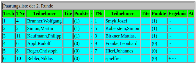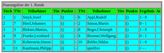 Wie bei Turnieren im Schweizer System üblich, kommt es in der ersten Runde zum Aufeinandertreffen der Setzlisten-Oberen gegen die unteren der Setzliste, so dass wir in Runde 1 durchweg Favoritensiege zu verzeichnen haben, mit zum Teil ziemlich kurzen Partien von unter 20 Zügen.