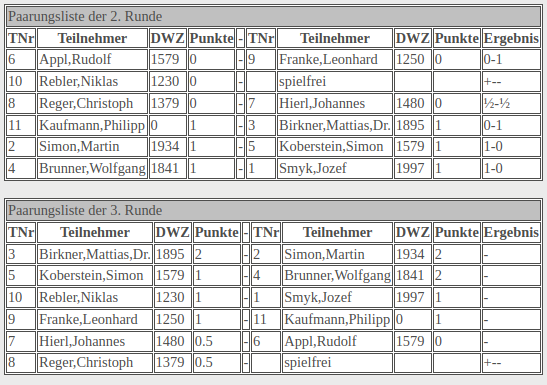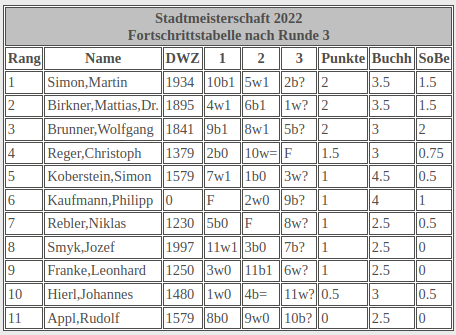 In der Begegnung der Generationen Rudolf Appl gegen Leonhard Franke verpasste der Senior den möglichen Vorteil und musste nach Figurenverlust aufgeben. Nur die Partie zwischen Christoph Reger und Johannes Hierl endete in einem gerechten und ereignisarmen Unentschieden.