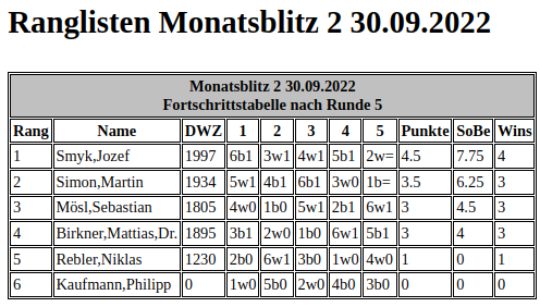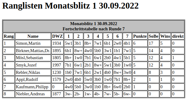 Nur 7 spielwillige Spieler fanden sich am Freitag im Gesindehaus ein, um das Monatsblitzturnier auszutragen. Mit nur einer Niederlage gewann Martin Simon vor Mattias Birkner (punktgleich mit Jozef Smyk).
