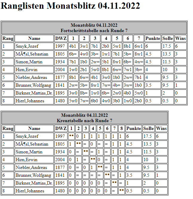 Modus: der Modus (Rundenturnier oder CH-System) und Bedenkzeit wird so gewählt, dass vor Mitternacht Schluss ist (abhängig von Teilnehmerzahl). Eventuell spielen wir doppelrundig.