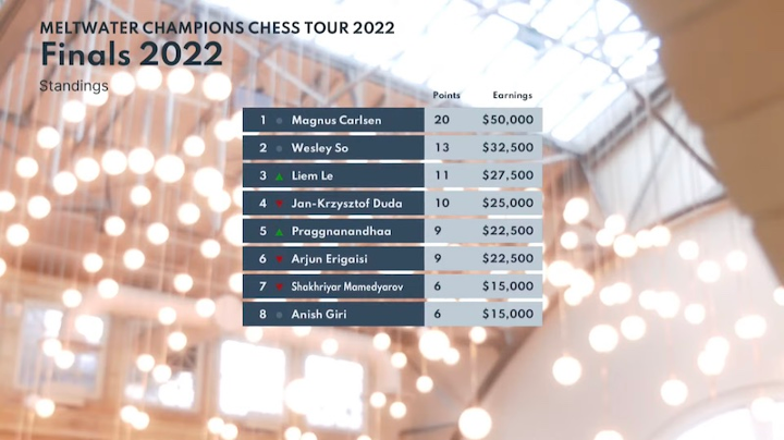 Vom 14. – 20. November findet das Finale der Champions Chess Tour statt. Wie bei den beiden anderen Majors zuvor spielen acht Spieler – Magnus Carlsen, Anish Giri, Praggnanandhaa, Wesley So, Arjun Erigaisi, Jan-Krzysztof Duda, Shakhriyar Mamedyarov und Liem Le – ein Rundenturnier mit Matches über vier Partien. Bei Unentschieden folgt ein Blitzentscheid und ggf. eine Armageddon-Partie.