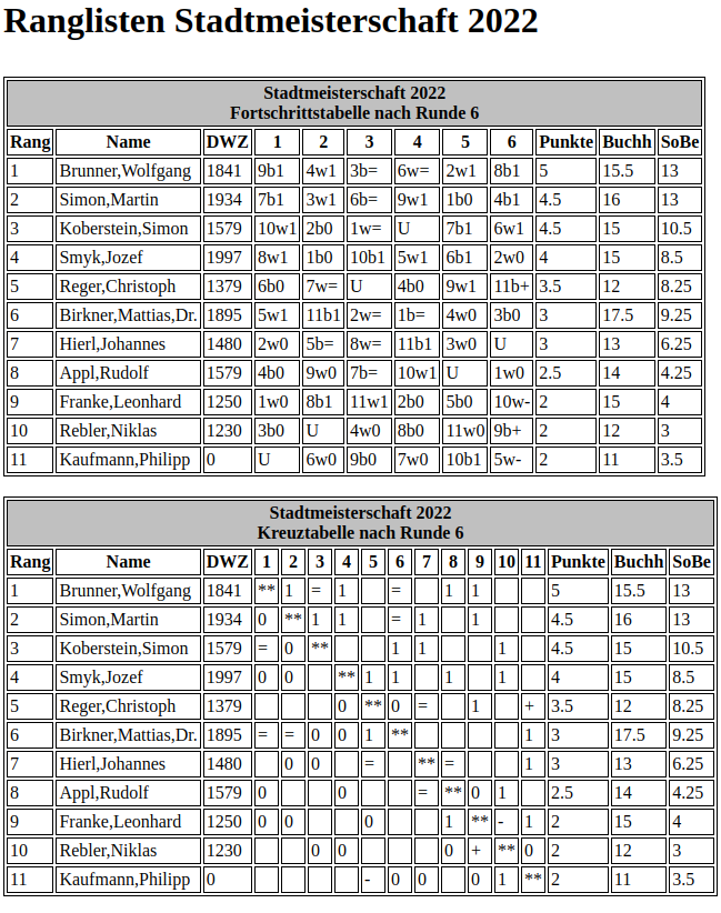 Der Tabellenführer Wolfgang Brunner hatte es mit den schwarzen Steinen mit dem Turniersenior Rudi Appl zu tun, der sich in der Frühphase der Partie durch beherztes Spiel einen komfortablen Vorteil hätte sichern können, stattdessen aber eine Figur verlor, und Wolfgang zur Verteidigung der Tabellenspitze verhalf.