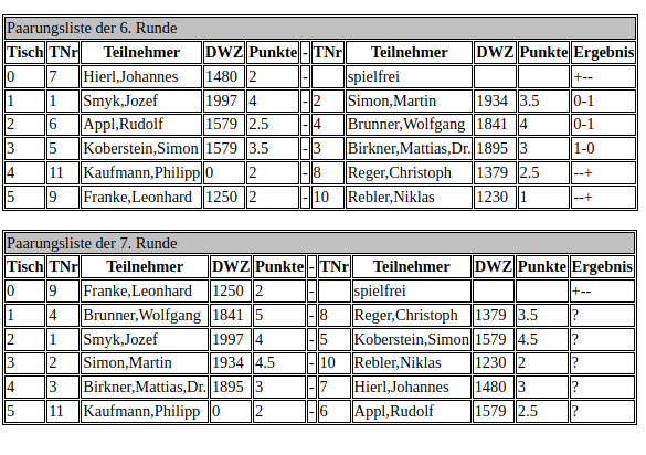 Mattias Birkner musste sich mit Schwarz mit den Turnierjunior Simon Koberstein messen. In der italienischen Partie kam es rasch zu einer relativ symmetrischen Stellung, doch Simon griff kurz vor dem 20. Zug fehl und musste seinen Springer auf ewig auf dem Eckfeld h1 beerdigen und zudem einen Bauern geben. Doch den Berichterstatter ereilte gleich darauf der vielen Schachfreunden bekannte Moment, in dem man seinen Stein loslässt und denkt: „Das kann nicht richtig sein.“.Das war es auch nicht, der Enginebalken schwankt von minus vier auf plus vier, weil auf einmal Mattias Dame kein Rückzugsfeld mehr hat, und sie nur durch Aufgabe einer Figur und gleichzeitiger Wiederbelebung der Springermumie auf h1 gerettet werden kann. Simon spielte seinen Vorteil dann relativ sicher aus und verwertete seinen Vorteil in einem hübschen Finale souverän zum Sieg.