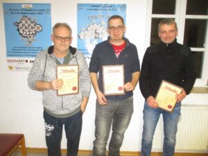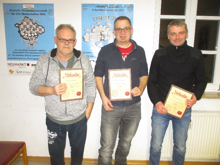 Die vorletzte Runde sah das zweite Remis von Ralf an diesem Abend, diesmal konnte Andreas seinen Siegeszug stoppen. Der Titel war ihm dennoch nicht mehr zu nehmen, da Erwin gegen Ihor den Kürzeren zog. Letzterer lag damit wieder auf Rang drei, hatte aber zum Abschluss spielfrei und musste mitansehen wie Erwin wieder an ihm vorbeizog. Dieser Erfolg reichte mit 9 Punkten sogar für Platz zwei, da Jozef gegen Christian Junker verlor. Dank der besseren SoBe blieb Jozef mit 8,5 Zählern als Dritter auf dem Podest vor Ihor, der dafür mit Abstand die Jugendwertung für sich entscheiden konnte. Ebenfalls knapp am Podest vorbei schrammte Andreas mit 8 Punkten, dem sein Dameneinsteller gegen Andreas Hierl letztlich teuer zu stehen kam. Nach dem schlechten Start mit 1,5/5, ließ er 6,5/7 folgen und wurde nur vom Turnierende gebremst. Souveräner Sieger des Abends mit satten zwei Punkten Vorsprung war Ralf, der sich damit erstmals den Titel des Blitz-Stadtmeisters sichern konnte (er hat in den letzten 15 Jahren aber auch nur dreimal mitgespielt).