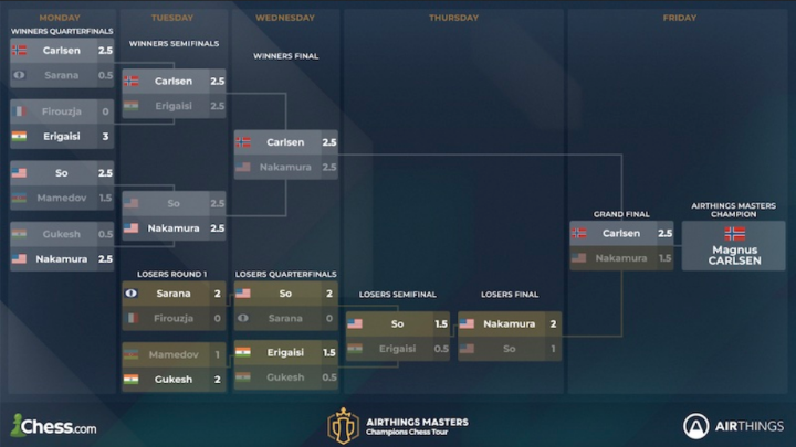 Die Champions Chess Tour geht in neuem Gewand in ihre nächste Saison. Nach der Übernahme der Play Magnus Group durch Chess.com Ende letzten Jahres bekommt die CCT ein neues Format. Über das Jahr gibt es sechs Turniere beginnend mit dem Airthings Masters vom 06. – 10. Februar und am Ende der Tour treffen die besten Acht im Finale aufeinander. Für den Auftakt sind nur Magnus Carlsen als Titelverteidiger und Wesley So als Sieger der Global Chess Championship 2022 gesetzt. Die anderen sechs Teilnehmer werden durch ein sogenanntes Play-In Qualifikationsturnier ermittelt. Dies fand am 3. Februar mit 146 Teilnehmern statt. Gespielt wurden neun Runden CH-System bei einer Bedenkzeit von 10+2. Hierbei setzte sich Gukesh mit 7,5 Punkten vor zehn Spielern mit je 6,5 durch. Danach standen Matches über zwei Partien sowie ggf. Armageddon auf dem Programm. Die besten Sechs trafen dabei auf die Spieler auf den Rängen 7-12 mit der Besonderheit, dass sich die Top-6 der Reihe nach ihren Gegner auswählen konnten.