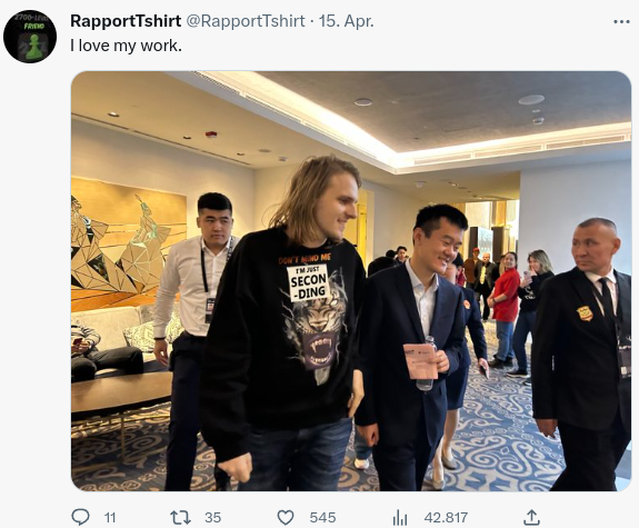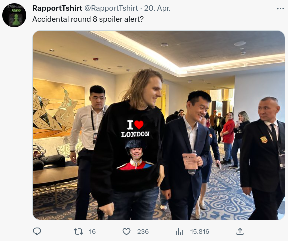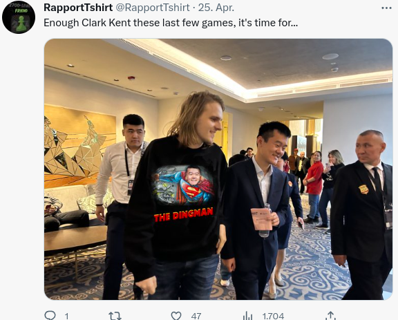 Legendenstatus hat jetzt schon die „Bromance“ zwischen Ding und seinem offenbar einzigen Sekundanten von Rang, dem ungarischen Spitzen-Großmeister Richard Rapport, der Ding nicht nur schachlichen sondern offenbar auch psychologischen Beistand bot. Immerhin lag Ding im gesamten Wettkampf drei Mal in Rückstand und kämpfte sich mit präzisen Zügen und manchmal ein bisschen Glück („der gute Spieler hat immer Glück!“, J.R. Capablanca) zurück ins Match. Das einzige Mal als er in Führung ging – zum 2,5:1,5 im Tiebreak – war er prompt Weltmeister.