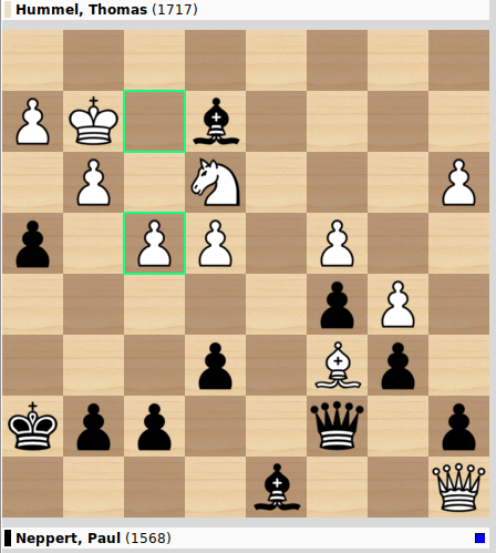 Noch dramatischer ging es in der Begegnung zwischen Thomas Hummel und Paul Neppert zu. Paul kam gut aus der Eröffnung und konnte bald ein prächtiges Läuferpaar den Stolz seiner Stellung nennen. Als dann Thomas auf Bauernjagd seine Dame in den hintersten Winkel des Brettes (a6 und a8) beorderte, zogen allmählich schwarze Gewitterwolken um Thomas König auf. Nach der fatalen Öffnung der eigenen Königsstellung wurde es auf einmal eng für Thomas König und er durfte sich von nun an keinen Fehltritt mehr erlauben.
