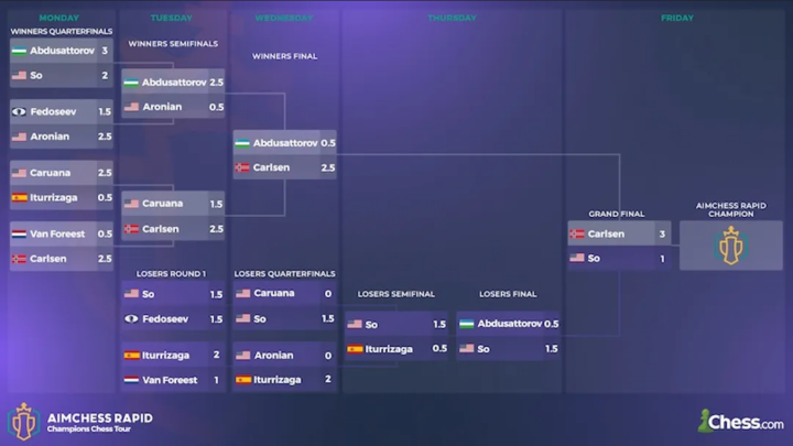 Die vierte Etappe der Champions Chess Tour, das Aimchess Rapid, findet vom 10. – 14. Juli statt. Magnus Carlsen musste sich erstmals über das Play-In qualifizieren und schaffte dies genauso so wie Wesley So, Levon Aronian sowie Eduardo Iturrizaga Bonelli. Matthias Blübaum trit in Division III an.