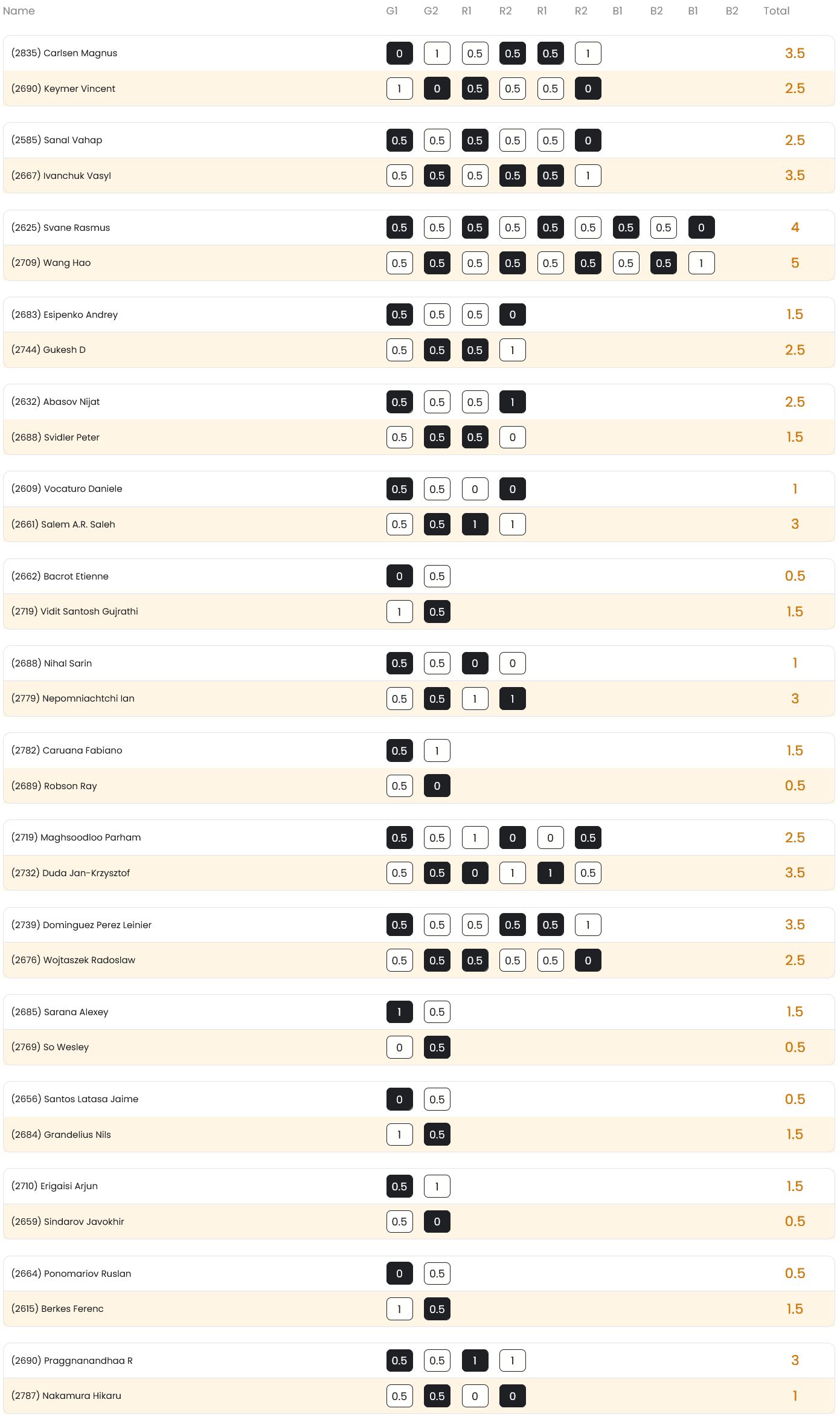 Vincent Keymer, Rasmus Svane und Elisabeth Pähtz setzten sich jeweils 1,5:0,5 durch, während Daniel Fridman als erster Deutscher ausschied. Fünf Herren mussten in den Tie-Break und mit Ausnahme von Frederik Svane gewannen alle die erste Schnellschachpartie. Doch leider kassierten drei von ihnen den Ausgleich und letztlich erreichten Matthias Blübaum und Alexnader Donchenko die dritte Runde. Von den Top-Favoriten standen Hikaru Nakamura und insbesondere Wesley So kurz vor dem Ausscheiden, Nodirbek Abdusattorov unterlag Vahap Sanal mit 0,5:1,5 und auch Shakhriyar Mamedyarov musste gegen Jingyao Tin die Segel streichen. Weitere prominente Namen die es nicht in Runde drei geschafft haben sind Alexander Grischuk, Sam Shankland, Boris Gelfand, Sara Khadem, Kateryna Lagno und Nana Dzagnidze.