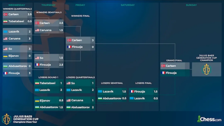 Die fünfte Etappe der Champions Chess Tour, der Julius Baer Generation Cup, findet vom 30. August – 03. September statt. Magnus Carlsen, Fabiano Caruana, Alireza Firouzja, Nodirbek Abdussatorov, Wesley So, Pavel Eljanov, Amin Tabatabaei und Denis Lazavik bilden das Feld der Division I, Matthias Blübaum tritt in Division III an.