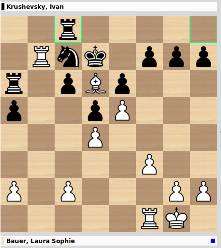 Erwin-Bezwinger Ivan Krushevsky hatte es mit Vereinsmeisterin Laura Bauer zu tun, und kam schon in der Eröffnung früh auf die schiefe Bahn als er Lauras schwarzfeldrigem Läufer die Dominanz der schwarzen Felderschwächen erlaubte und ihr überdies noch die Kontrolle der einzigen offenen Linie mit den Türmen überlassen musste.