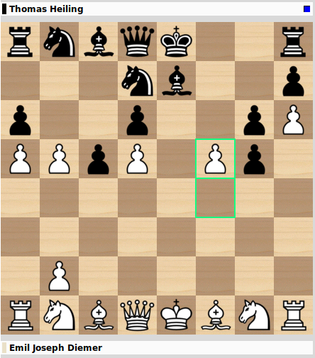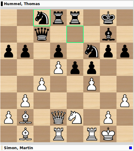 Im ersten Nachholspiel der zweiten Runde spielte Martin mit den weißen Steinen gegen Thomas, der es wieder einmal mit „seiner“ Aljechin-Verteidigung versuchte. Die Idee, die weißen Bauern frühzeitig nach vorne zu locken, um sie dann mit aktivem Figurenspiel zu attackieren, ging aus Thomas Sicht allerdings ziemlich schief. Nicht nur, dass er sehr wenig Raum für seine Figuren hatte, anstatt seinerseits die weiße Bauernkette anzuknabbern, ließ er sich zu einem Bauernvorstoß seiner Königsbauern hinreißen und geriet früh in Schieflage.