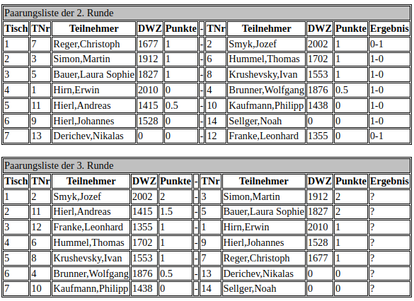 A propos dubiose Eröffnungen: in der Zweitrundenbegegnung zwischen Erwin Hirn und Wolfgang Brunner machte Erwin – wie berichtet – acht Bauernzüge in Folge. Wie Wolfgang hinterher berichtete, liegt der Weltrekord der meisten aufeinander folgenden Bauernzügen in der Eröffnung bei 17! Aufgestellt von Emil Joseph Diemer beim Nürnberg Open 1984, der die Partie gegen Thomas Heiling zwar gewann, zur Nachahmung empfohlen ist die Eröffnung trotzdem nicht.