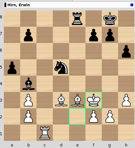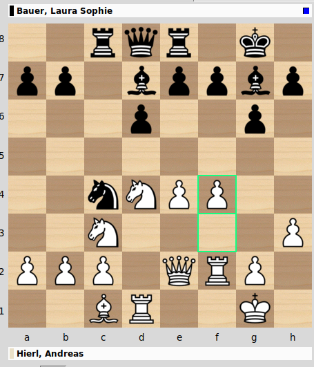 Laura konnte gegen Andi Hierl durch einen kleinen taktischen Trick einen Bauern erobern und das entstehende Endspiel mit Läufer gegen Springer ziemlich souverän gewinnen. Damit übernimmt sie mit drei Punkten aus drei Partien die alleinige Tabellenführung.