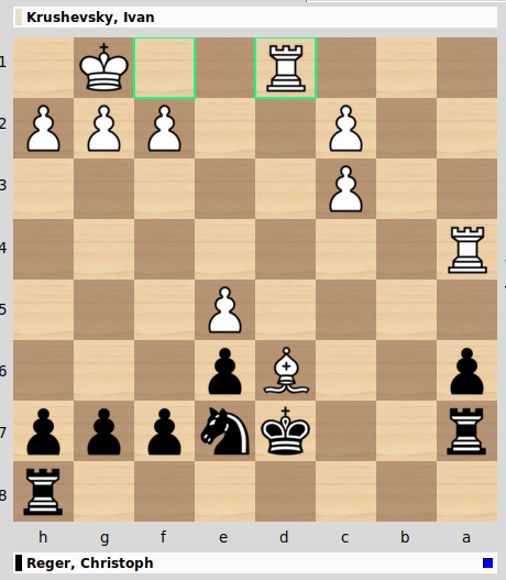 Das Drama des Abends entspann sich zwischen den „rising stars“ Ivan Krushevsky und Christoph Reger, der einen rabenschwarzen Tag erwischte und mit Schwarz ziemlich schnell ziemlich schlecht stand, auch weil Ivan einen äußerst unangenehmen Läufer auf d6 einbetonieren konnte, der dem vielzitierten „rostigen Nagel im Knie“ (Wilhelm Steinitz, erster Schachweltmeister) sehr nahe kam.