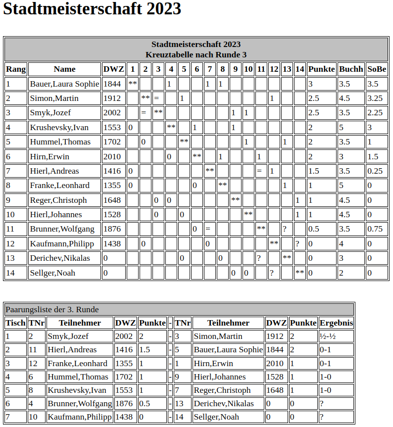 Die Partien Kaufmann – Sellger und Brunner – Derichev werden am kommenden Freitag, 20.10.2023 nachgespielt, die vierte Runde findet am 27.10.2023 statt.