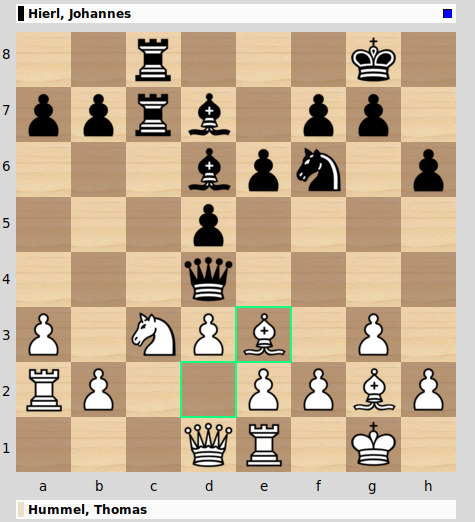 Johannes hingegen kam ziemlich gut aus der Eröffnung, bis er fehlgriff und seine Dame wirkungslos auf den Königsflügel drängen ließ und einen Bauern verlor.