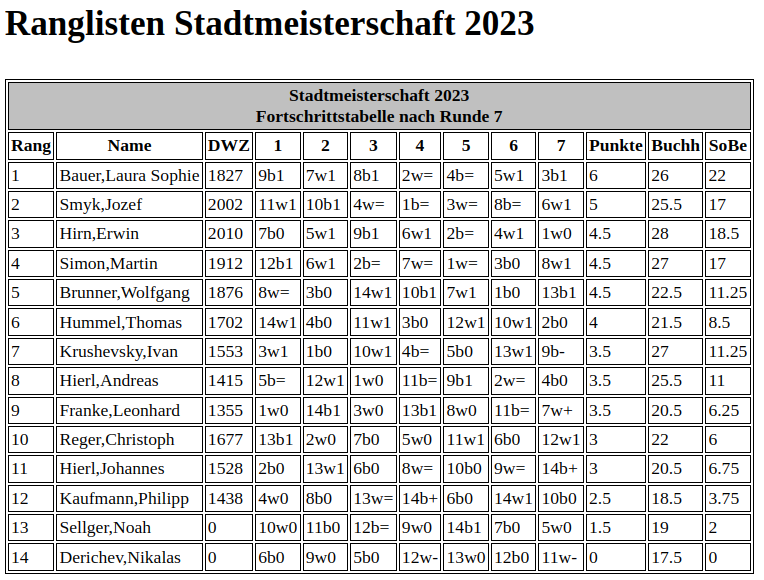 22:52 Uhr. Die Spannung löste sich von Spielern und Zuschauern als Erwin Hirn Laura Bauer nach einer intensiven Partie in der 7. Runde die Hand zur Aufgabe reichte, und zum Sieg der Stadtmeisterschaft gratulierte. Zum zweiten Mal nach der Vereinsmeisterschaft 2023 siegte Laura in einem Turnier mit klassischer Bedenkzeit im Schachklub Neumarkt, diesmal aber noch souveräner. Wer da nicht ergriffen war, hat sich auch gefreut als Harrys Hauself Dobby ermordet wurde.