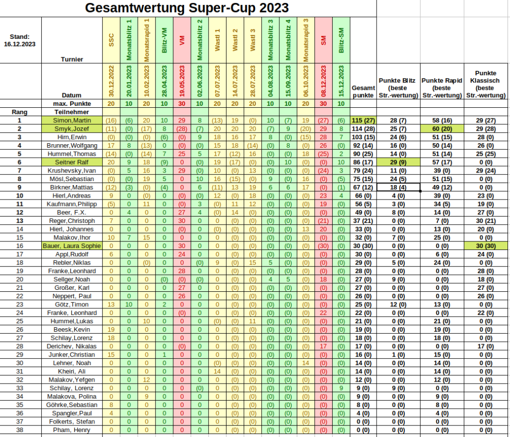 Mit der gestrigen Blitz-Stadtmeisterschaft ging auch der Super-Cup 2023 zu Ende, einer Gesamtwertung aus Monats-Blitz und Rapidturnieren, sowie den wichtigsten klassischen Turnieren.