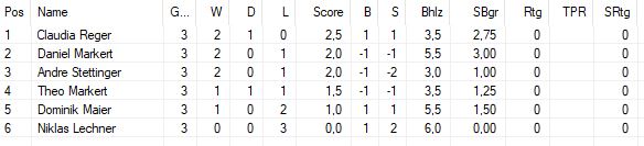 Auch für den Breitenschach richten wir einen Vereinspokal aus. Dieser wird nicht im double elimination Modus ausgetragen, sondern in kleinen Turnieren mit jeweils 3 Partien pro Spieltag. Aufgrund der Unterstufenparty der Gymnasien fanden sich nur sechs Teilnehmer. Umso mehr hat es mich gefreut, dass sich mit Claudia Reger und Daniel Markert zwei Elternteile getraut haben, das Turnier mit aufzumischen. Komplettiert wurde das Feld von Dominik Maier, Andre Stettinger, Theo Markert und Niklas Lechner. Am Ende setzte sich die Erfahrung der „Großen“ durch. Claudia Reger sicherte sich vor Daniel Markert den ersten Platz. Andre Stettinger erreicht als bestes Kind den dritten Platz.