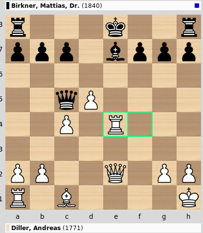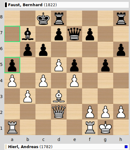 An Brett 1 kam Andi Hierl zu seinem ersten Spitzenbretteinsatz in der Bezirksliga, bei dem er seinen Gegner mit einem ruhigen, positionellen Aufmarsch am Königsflügel unter Druck setzte. Mit einem feinen Bauernopfer erzwang er die „Halböffnung“ der Linie vor dem gegnerischen König, und dem Druck konnte Andis Gegner schließlich nicht mehr standhalten.