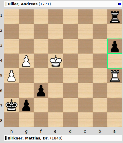 Mattias konnte sich inzwischen aus der Umklammerung seines Gegners lösen, und weil dieser – angesichts des Spielstandes – ein Remis durch Dauerschach verschmähte in ein besseres Endspiel überleiten. Leider tauschte Mattias hier vorschnell die Läufer für ein reines Turmendspiel. „Alle Turmendspiele sind Remis!“, sagte Dr. Tarrasch, was natürlich nicht stimmt, aber das Remispotential liegt immer in der Luft, wie die folgende lehrreiche Stellung zeigt: