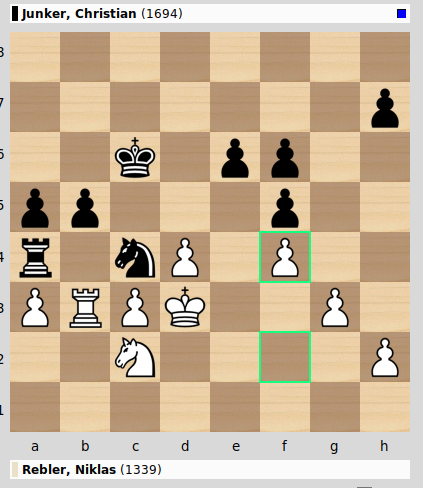 Die Nachholpartie zwischen Niklas Rebler und Christian Junker verlief durchweg in ruhigen Bahnen mit in der zweiten Halbzeit minimalen Vorteilen für Christian aus denen sich aber letztlich nicht rausholen ließ.