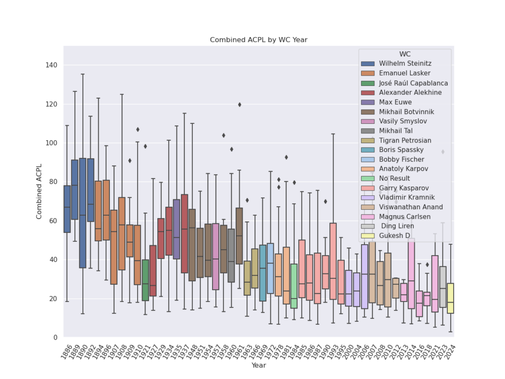 Aus Interesse und aktuellem Anlass habe ich mal die alte Lichess-Untersuchung zur Qualität historischer WM-Matches fortgeführt. Konkret geht es dabei darum, für jeden Zug einer WM-Partie die Abweichung vom besten Computerzug (Stockfish14, depth ca. 20, ELo ca. 3000) in Centi-Bauern (engl. Centipawn CP) zu berechnen, um so die Qualität einer Partie als „durchschnittlicher CP-Verlust“ ACPL zu berechnen. Aktuellen Schätzungen zufolge liegt der ACPL eines Super-Großmeisters in einer guten Partie bei etwa 10-20. Für die WM-Matches wurde als Metrik der „combined ACPL“ (cACPL) verwendet, was einfach die Summe des ACPL beider Spieler der Partie ist.