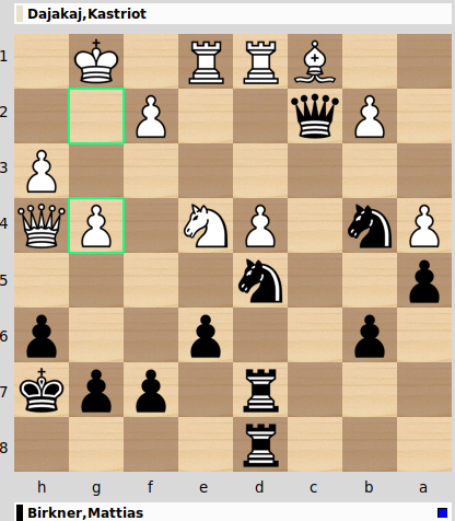 Nur noch Turm- und Läuferpaare waren bei F.X Beer (Brett 3) auf dem Brett und leider hatte F.X. seinem Gegner erlaubt, einen schwarzen Läufer auf f3 vor dem offenen König zu platzieren. Als dann noch ein Turm auf der h-Linie auftauchte, war plötzlich das Matt auf h1 nicht mehr zu decken! Abruptes Ende eines ansonsten guten Spiels. 3:2