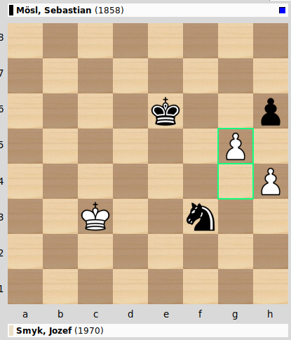 Sebis Springeropfer 59…Sxg5! 60.hxg5 hxg5, wonach der schwarze