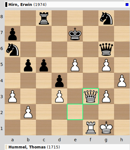 Ziemlich ungestüm ging es Thomas gegen Erwin an, der gleich einen ganzen Turm für die drei Bauern vor Erwins schwarzen König gab. Wenig später wurde der Mehrturm in zwei Mehrfiguren umgewandelt, und eigentlich sollte das eine klare Sache für Erwin sein, aber sein König stand eben sehr unsicher und Thomas fand doch noch ein Durchkommen.