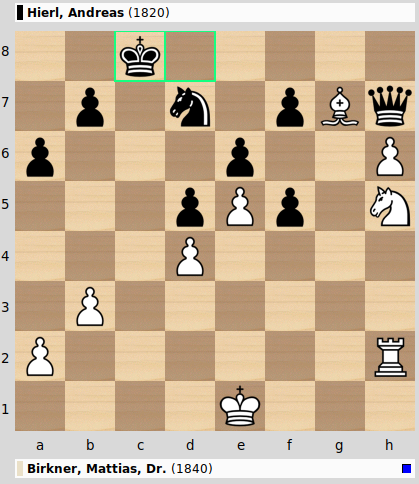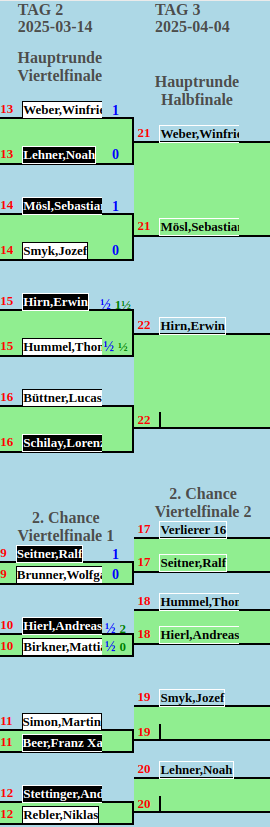 Dann also in den Blitz-Tiebreak. Und ganz ehrlich, nach der aufregenden Hauptpartie helfen mir auch ein paar Jahrzehnte Lebenserfahrung nicht weiter, im Gegenteil. Die erste Partie glatt verloren. Die zweite dafür nicht ganz so glatt. Ich darf jetzt um Platz 13 kämpfen und Andi erhält die zweite Chance gegen Thomas.