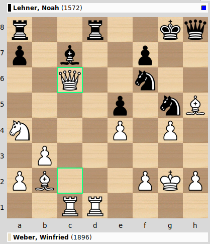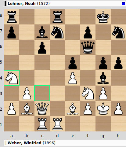Die zwei Überraschungssieger der ersten Runde spielten Ihr Viertelfinale bereits letzte Woche aus und das hatte es in sich. Winnie erhielt als Weißer eine gute Stellung aus der Eröffnung heraus, beherrschte die zentralen Linien, während Noahs Figuren noch etwas unkoordiniert wirkten. Trotzdem entschied sich – allen Faustregeln zum Trotz („den Angriff erst starten, wenn Deine Armee dafür optimal aufgestellt ist“) – zu einem Angriff auf Winnies König.