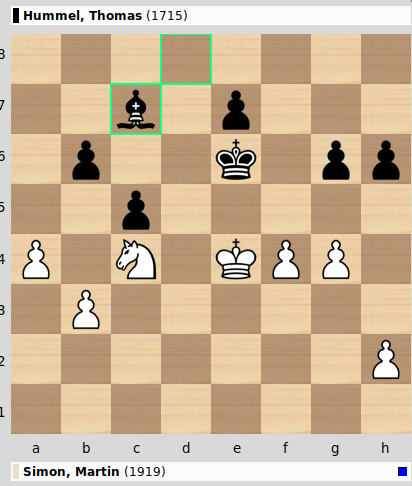 Eines kann als sicher gelten: Thomas Hummel ist am besten, wenn er ausgangs des Mittelspiels noch mindestens einen Springer übrig hat. Diese Erkenntnis schien Martin Simon verinnerlicht zu haben, war er es doch, der nach kurzer Durststrecke im Mittelspiel in ein Endspiel mit gutem Springer gegen Thomas schlechten Läufer überleiten konnte. Dabei stellte er seinen Springer aktiv gegen den untätigen Läufer von Thomas und Rest war eine Frage der Technik.