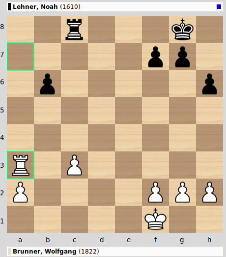 Gehen wir also zurück zur Stellung von Brunni gegen Noah. Potentiell verbleibt also Wolfgang mit einem Mehrbauern auf der a-Linie. Und wie es ausschaut, bleibt der weiße Turm vor seinem Bauern (Türme gehören immer hinter den Freibauern – egal ob Verteidiger oder Angreifer) und der schwarze Turm kann den weißen König lange von seinem Bauern abschneiden und eine Position hinter dem Bauern einnehmen. Nehmen wir außerdem an, dass die Bauern am Königsflügel abgetauscht werden und verschwinden. Nun gibt es zwei Zielszenarien für den Verteidiger: