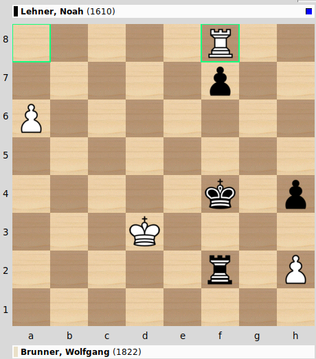 Weia! Bei Noah hat offensichtlich die Abteilung Attacke das Kommando übernommen. Das sofortige Ta2 hätte zwar für das Remis gelangt, aber Noahs gieriges Txh2?? verliert nach a7 den Turm und die Partie, weil Schwarz eben kein Patt erzwingen kann, wie erhofft.