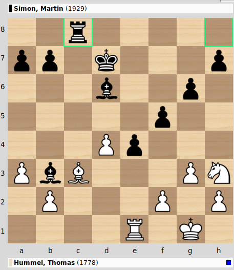 Die Eröffnung dieser Partie ist Thomas Hummel als Weißem ziemlich misslungen. Das ist nicht zu hart formuliert, wenn man diese Stellung nach Zug 25 anschaut: