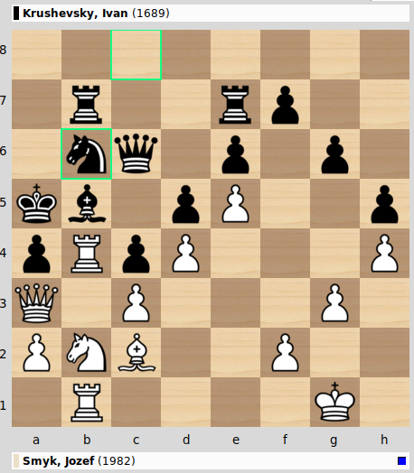 Upps. Sieht so aus, als sei Ivan auf die falsche Seite rochiert, weil eine Öffnung der b-Linie in der Luft liegt. Nun ist Jozef bekanntlich ein Spieler, der Druck aufbauen und dann so lange warten kann bis der Gegner unter dem Druck zusammenbricht. Ivan hielt lange Stand und es war erst in Zug 46 als die Situation eskalierte: