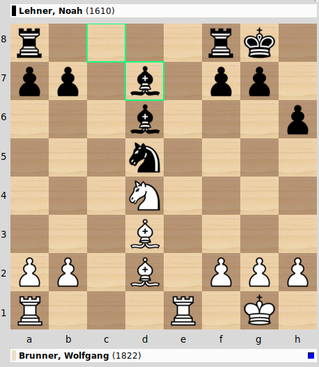 Schwarz kann den Turm mit drei Figuren wiedernehmen: 21…Lxe1? ist zweifelhaft, weil nach 22.Sf5 der Ld6 angegriffen ist und Sxh6 droht (wegen des Angriffs auf den Sf6). Nach 21…Sxe8 macht der Springer keinen besonders guten Eindruck und auch die Läufer stehen eher passiv rum. 21…Txe8 gibt mit 22.Lxb7 einen Bauern, was nicht unbedingt ein Problem sein muss, wenn man die Chancen im Endspiel mit Minusbauer richtig einschätzt. Noah entschied sich für das Nehmen mit dem Springer und verlor nachher doch noch einen Bauern: