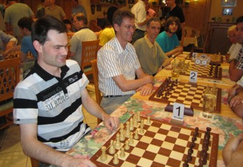 Zunächst ging es gegen den Gastgeber (Schnitt 1971) und es sah lange Zeit sehr gut aus. Kevin brachte uns mit einem schönen Erfolg inklusive Damenopfer gegen Andreas Zach in Führung und auch im Duell zwischen Martin und Oliver Puschak waren die Vorteile auf Neumarkter Seite. Vorne stand Sebastian die ganze Partie über etwas gedrückt, bekam aber nach dem Abtausch aller Türme mit zwei unscheinbaren Angriffszügen auf einmal die Möglichkeit ein durchschlagendes Figurenopfer anzubringen, das vier Bauern brachte und letztlich auch die Figur zurück. Leider fand Sebastian in Zeitnot nicht die besten Züge und musste obendrein permanent die gegnerischen Drohungen mit Dame und Läuferpaar im Auge behalten. Mit Müh und Not fand er auf eine gegnerische Attacke gerade noch eine Möglichekit die Damen vom Brett zu bekommen (allerdings war beiden Spielern entgangen, dass Sebastian seine Dame einfach mit Schach hätte wegziehen und dann die gegnerische schlagen können…), stellte dann aber mit einem Katastrophenzug einen wichtigen Bauern ein. So blieb beiden Kombattanten je ein Freibauer sowie eine Leichtfigur um den gegnerischen zu stoppen – ergo remis. Der vergebene halbe Punkt war umso ärgerlicher, da Martin im Turmendspiel seine vielversprechende Stellung sogar noch verlor und Wolfgang am Ende dem Freibauernpaar von Friedrich Hanisch nichts mehr entgegenzusetzen hatte.